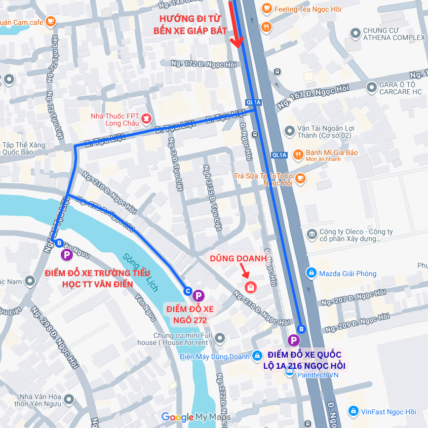 Cập nhật mới nhất: Nếu Quý khách di chuyển bằng ô tô thì Quý khách có thể dừng xe tại đầu ngõ 210 Ngọc Hồi QL1A sau đó đi bộ khoảng 100m vào Dũng Doanh. Điểm đỗ ở trường tiểu học Văn Điển xa vui lòng liên hệ nhân viên đón, điểm đỗ xe ngõ 272 gần nhưng có thể không đỗ xe được